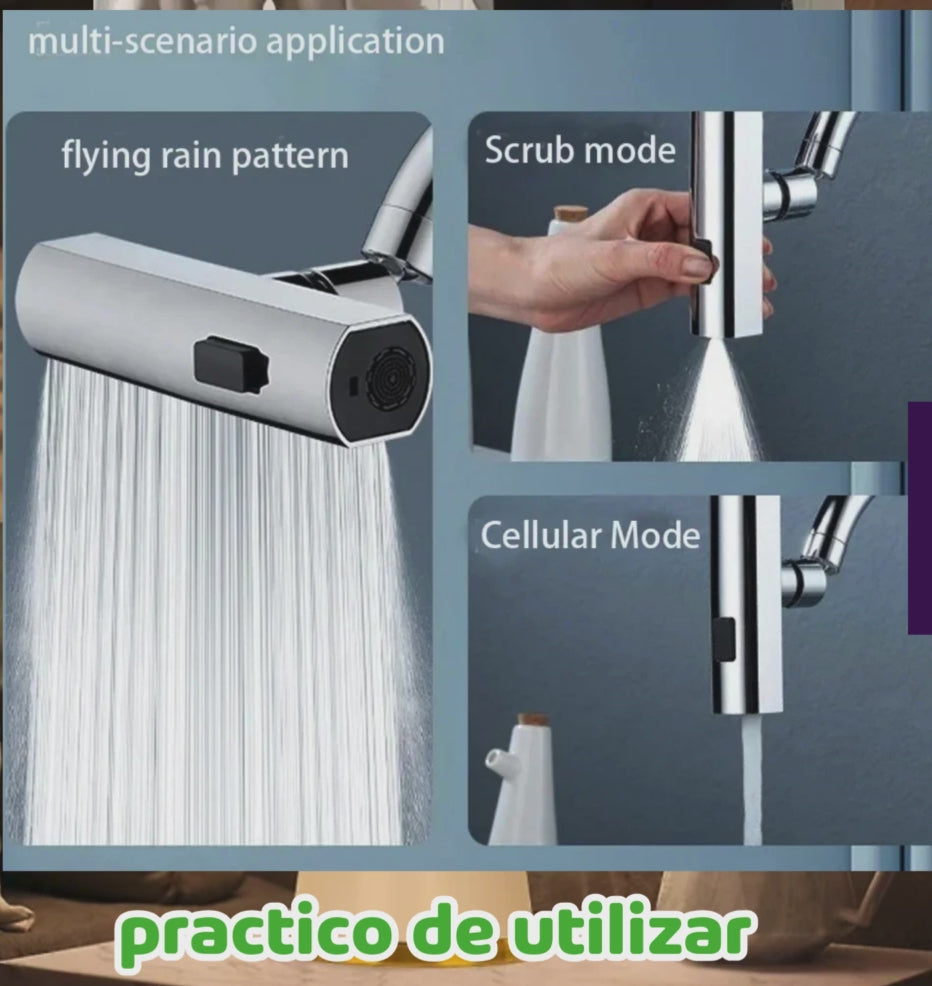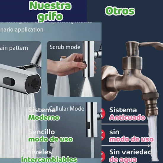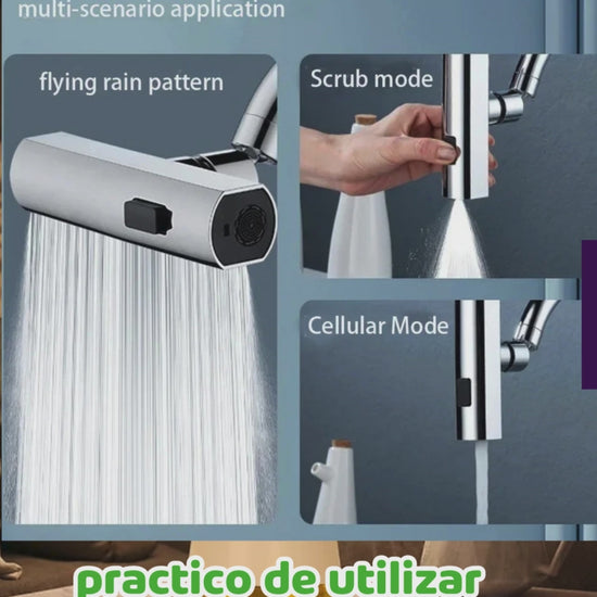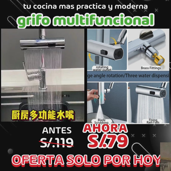 com nuestro caño multifuncional. tendras comodidad total en tu cosina. tres modos de agua para cada necesidad: lavar, enjuagar y ahorrar . practico , resistente y facil de instalar en segundos trans forma tu cosina hoy mismo